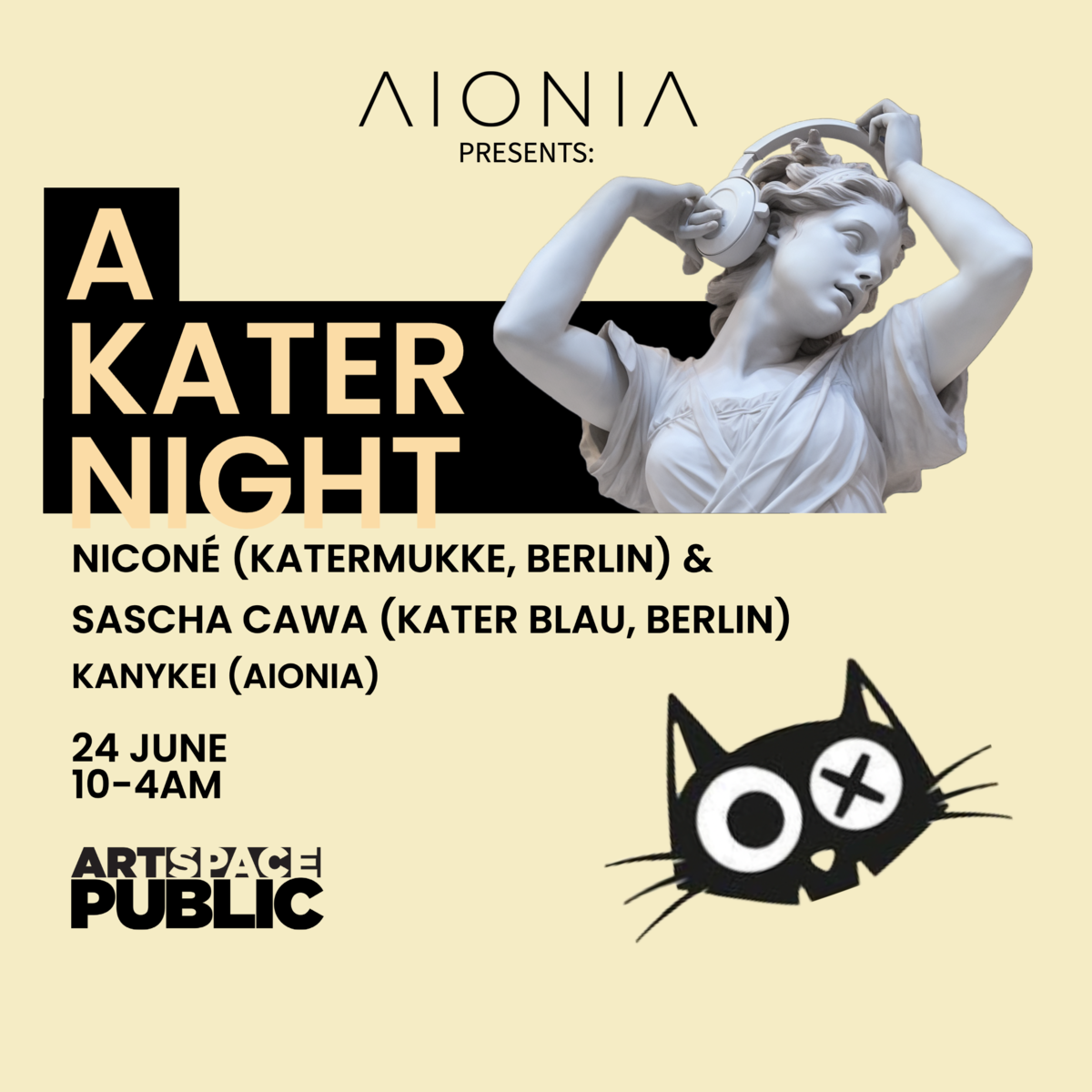 AIONIA presents Nicone and Sascha Cawa, KATER BLAU's resident DJ, straight from Berlin for an exclusive show at Public Hotel's Artspace, on 6.24. Get a taste of Berlin without leaving the city and experience 2 music legends for the 1st time in Manhattan. Tickets are limited so grab yours fast! Tables are available upon request, send email to: [email protected] About the artists: - Sascha Cawa: is a resident DJ of Kater Blau and an essential part of the Kater community in Berlin. He is the co-founder and one of the main producers of the label Katermukke. Sascha Cawa is renowned for his joint productions with Dirty Doering, with tracks such as the Bar 25 song "I Would". He is involved in the sounds of several other well-established, German artists such as Britta Arnold and Madmotormiquel. His latest own productions and remixes have been released on Heinz Music, Formatik, Ursl, Dear Deer and Karera. Sascha Cawa likes a good mix of festivals from larger events such as Fusion, Sonne Mond Sterne, Echelon and ADE to cosier ones like Garbicz or Button Beats. He plays in clubs all over Europe. - Nicone: is a Berlin based DJ and producer who gained prominence as part of the Kater Blau and Katermukke family. Nicone's music is characterized by a fusion of deep, melodic techno with elements of house and electronica. He has released numerous acclaimed productions on labels such as Katermukke, Bar25, and Stil vor Talent. His ability to create a unique atmosphere and connect with the crowd has earned him a dedicated following of techno enthusiasts. Nicone's contributions to the electronic music scene, both as a solo artist and as part of the Katerblau and Katermukke collectives, have solidified his reputation as a respected figure in the genre. His passion for music and his innovative approach to production continue to shape and inspire the techno landscape. - Kanykei: the founder of AIONIA is a DJ based out of NYC. She has performed alongside the likes of Rebolledo, Kimonos, Nhii, Chloe Callet in venues such as House of X, Artspace, Musica, Gospel etc.