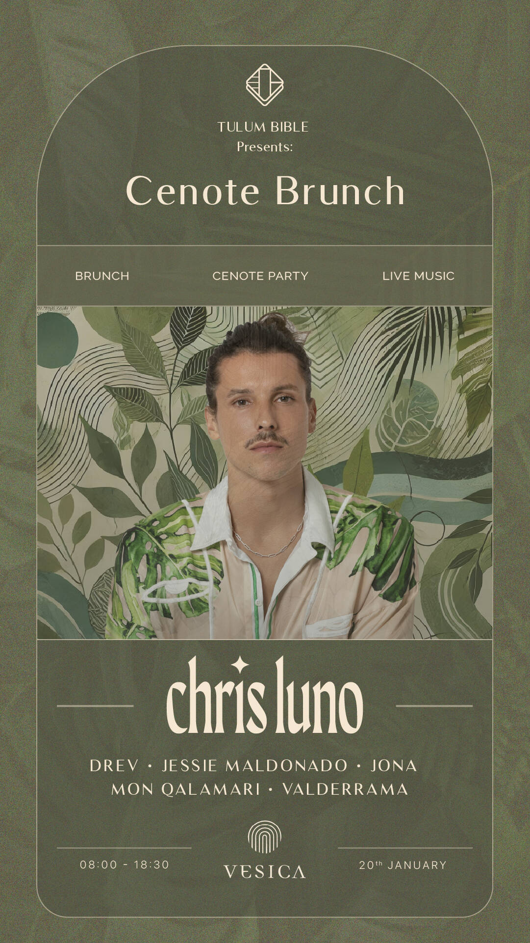 ChrisLuno will be joined by an incredible lineup of talented artists, including Drev, Mon Qalamari, Jessie Maldonado, and Valderrama. Together, they will create an unforgettable experience, blending their unique sounds to elevate this exclusive event. Don’t miss the chance to see these amazing artists perform at the stunning cenote!