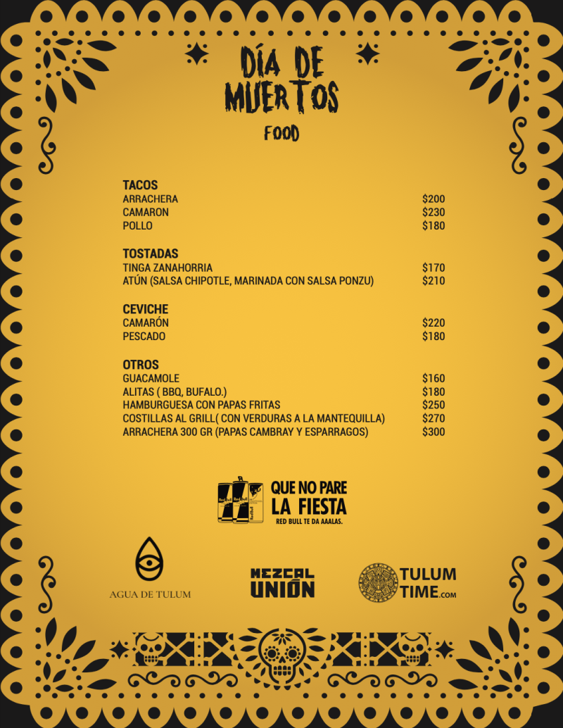 Come join Dia de los Muertos event (Day of the Dead) at Calavera Cenote from 5pm-3am with 5 great DJs. Enjoy fresh food menu and full bar available for purchase along with performers. Come and get your face or body paint artwork done with 7 different artists at the event on site (extra cost). Costumes optional, best option to come in all black or white and get body paint done, there is free parking on site. Enjoy a free Mezcal tasting and drink specials from Mezcal Union and Redbull, event is limited to 500 people and must 18+ to enter. Follow us on IG for updates @tulum.time