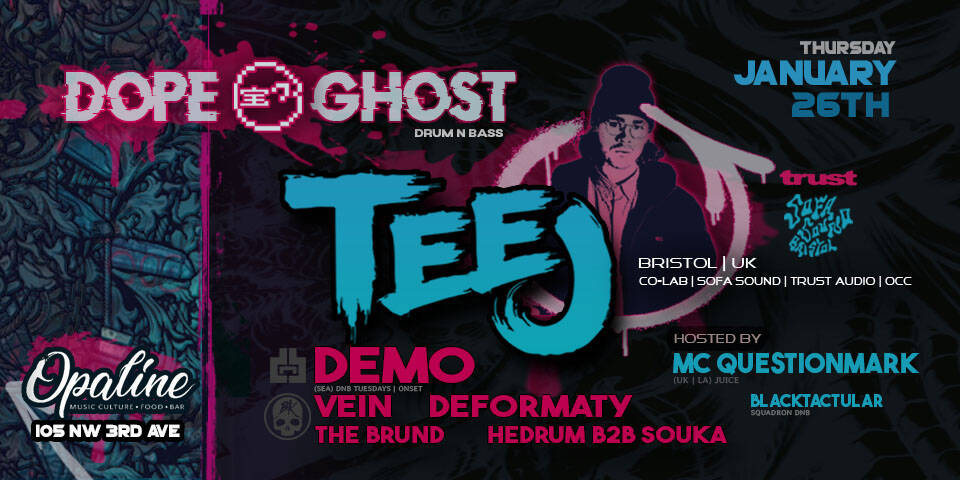 Dope Ghost is back at it again with our first event of 2023 at a new venue this time: Opaline in downtown Portland. We have an all drum n bass line up featuring TEEJ out of the U.K. off of his U.S. tour.