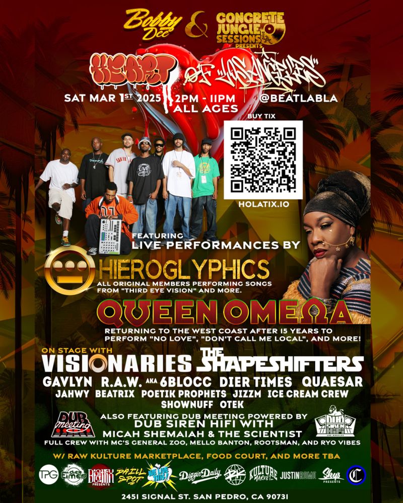 Adding to the energy, Concrete Jungle Sessions LA residents Dier Times, Jahwy, and Beatrix team up to hold down the stage between performances with Diggin' Daily's Otek and Shownuff. The stage will also feature performances from Original Junglist R.A.W. aka 6Blocc, and local hip hop staples Quaesar, Jizzm, Ice Cream Crew, and Poetik Prophets.