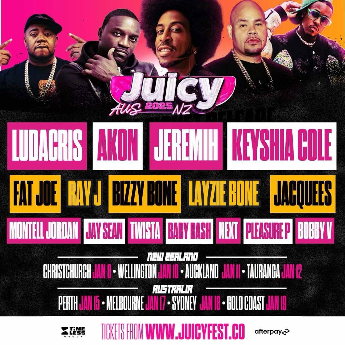 Coming along for the ride are Akon, Keyshia Cole, Jeremih, Ray J, Fat Joe, Bizzy Bone, Layzie Bone, Jaquees, Jay Sean, Montell Jordan, Twista, Baby Bash, Pleasure P, Bobby V and Next, all together on one line-up – Juicy Fest 2025 has the area codes covered this summer.