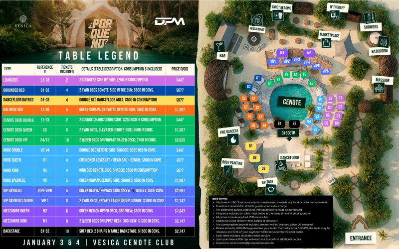 ¿PorQuéNo? Tulum shall not be held responsible for circumstances beyond its control, including but not limited to acts of nature, weather conditions, health crises, epidemics, pandemics, labor disputes, civil unrest, or actions mandated by government authorities. By purchasing a ticket, I acknowledge and accept that all tickets are non-refundable. I acknowledge that I assume all risks associated with attending the event and understand that no refunds will be provided under any circumstances, including but not limited to event termination, cancellation, absence due to illness, personal reasons, or modifications to entry conditions caused by weather, natural disasters, unforeseen circumstances, governmental regulations, the inability to secure necessary permits, or any other factors beyond the control of ¿Por Qué No? Tulum, including individual perspectives and assessments.