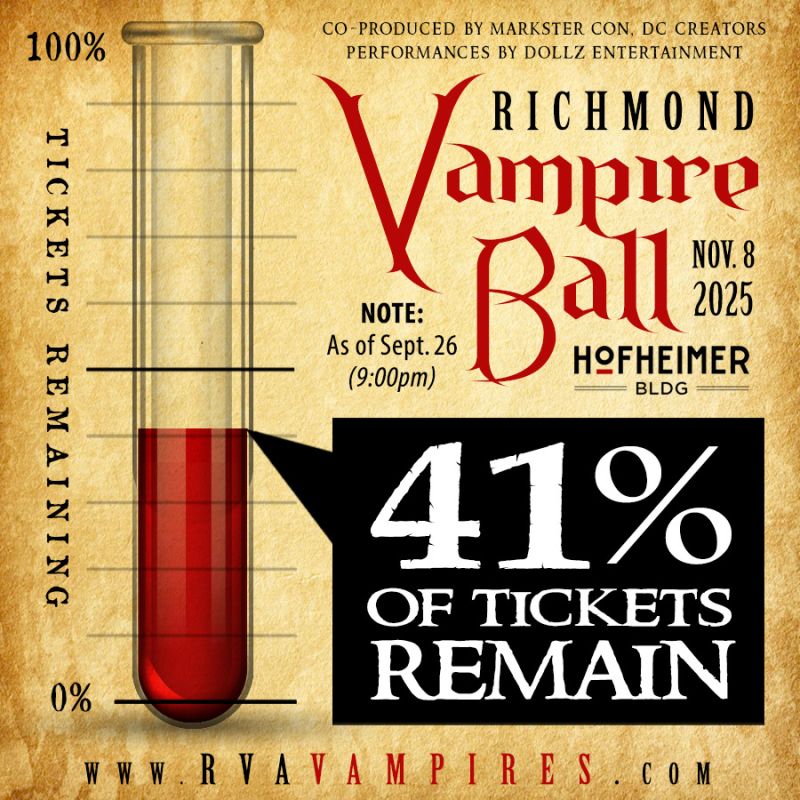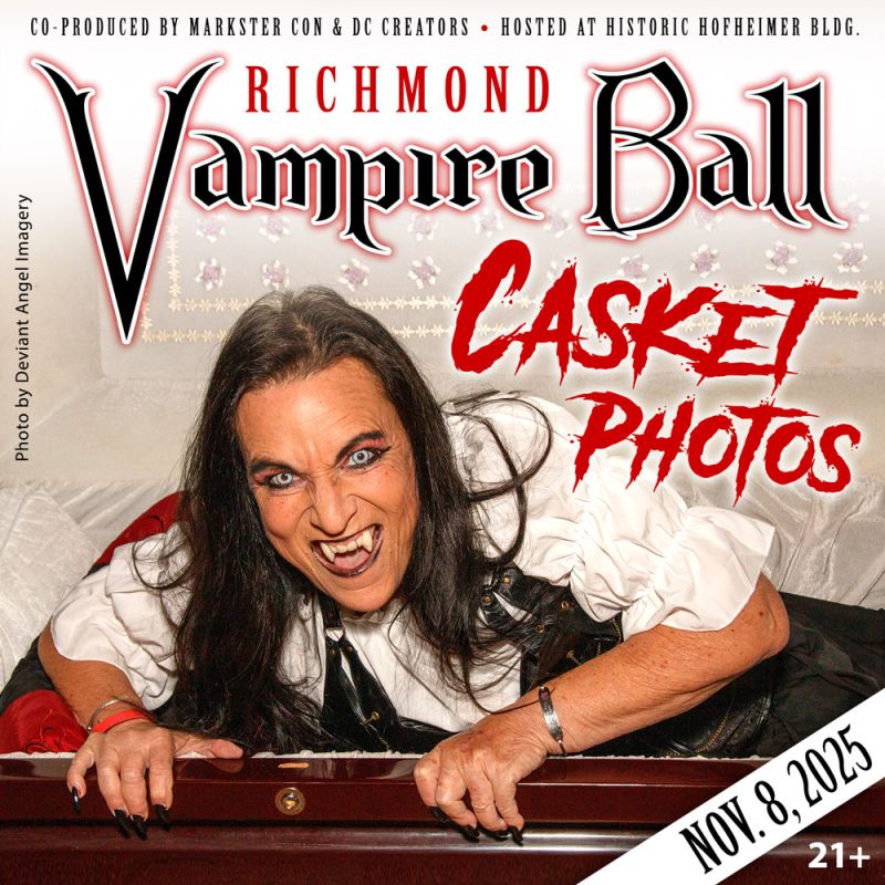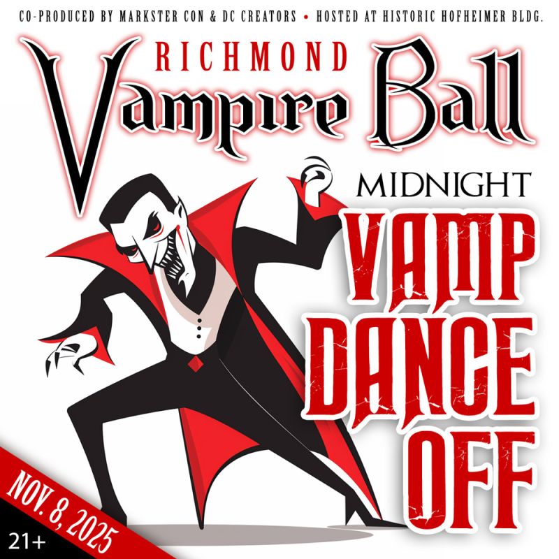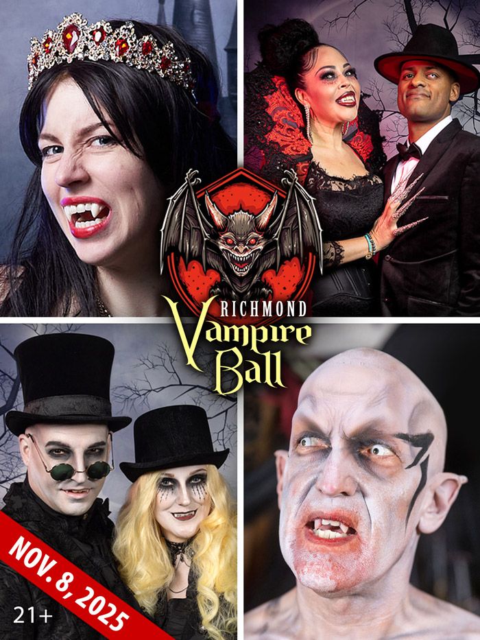 On Saturday, November 8th, 2025embrace the darkness and join your fellow creatures of the night as it'll be time to descend into Virginia's capitol again for a night like no other. Grab your capes, sharpen your fangs, dust off your boots and come quench your celebratory thirst as Richmond's annual VAMPIRE BALL materializes for one evening only.
