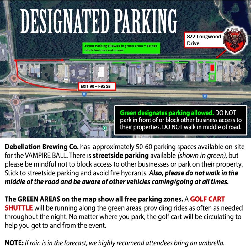 The 2025 VAMPIRE BALL will be hosted just outside of Savannah at Debellation Brewing Company (822 Longwood Dr, Richmond Hill, GA 31324). Debellation Brewing Co. is conveniently located right off Interstate I-95 at Exit 90 with numerous affordable hotels and restaurants just one exit away which is about a 20 minute drive from downtown historic Savannah.
