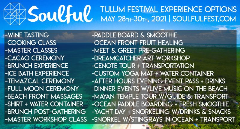 Soulful Festival will be hosted in Tulum Beach for 3 days at 7 beach front resorts and 13 locations total with 108 wellness classes to choose from along with 13 DJ's, live music, local adventures/tours and group dinner experiences together. Choose from a variety of wellness classes including yoga, sound healing, meditation, workshops, talks, master classes, beach activities, reiki, plant medicine, temazcal sweat lodge, silent disco, ecstatic dance, cacao ceremony and. more! Choose your ticket level and option to stay on site at one of our amazing beach front resort partners: Selina, Kanan, Ahau and Delek. Soulful Fest home is at Selina Beachfront Resort and Mia Beachclub with a complete buy out, creating an upscale private experience. The entire festival is location at 13 different locations, all with-in a 5 minute walk of each-other on the Caribbean Beach. Come fill your soul and connect with commUNITY!