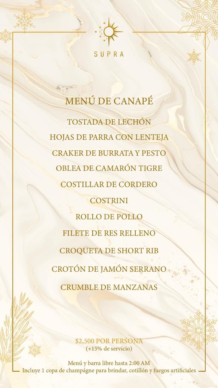 1.- Tostada de lechón con cremoso de Aguacate. (Tostada de hoja de arroz ). 2.- Hojas de parra rellenas de guiso de lenteja (al vapor con salsa de jocoque). 3.- Craker de burrata y pesto. 4.- Oblea de camarón tigre con alioli de Perejil y ceniza de habanero. 5.- Costillar de cordero en salsa de ciruela y pure de camote. 6.- Costrini (musse de queso azul,pera caramelizada ala naranja). 7.-Rollo de pollo en salsa de 3 pimientos. 8.-Filete de res relleno de parmesano y espinaca en salsa de miel o Croqueta de short rib en su jugo. 9.-Croton de jamón serrano (arugula baby,Aguacate romero y un toque de salsa de tres chiles no picante). 10.- Crumble de manzanas con helado de dulce de leche