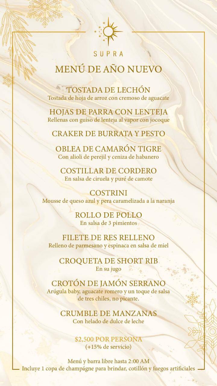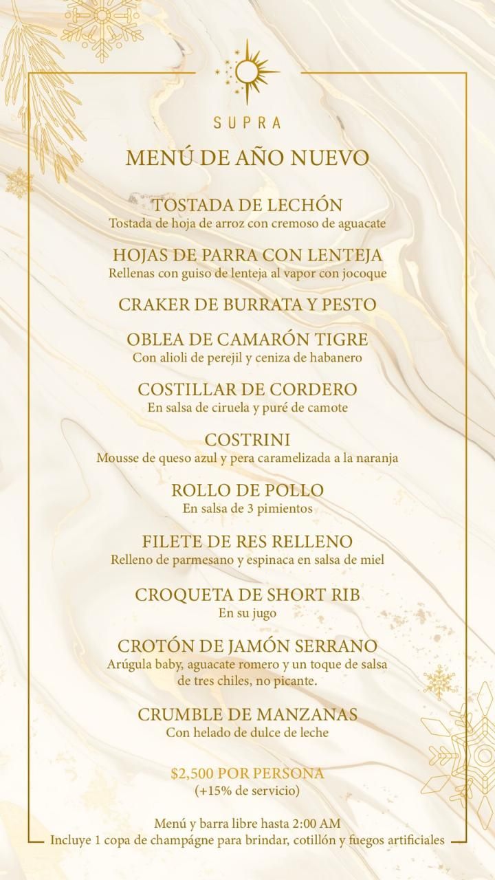 MENÚ Y BARRA LIBRE HASTA 2:00 AM $2,500 MAS SERVICIO + CARGO POR BOLETERIA INCLUYE 1 COPA DE CHAMPAÑA PARA BRINDAR COTILLÓN Y FUEGOS ARTIFICIALES