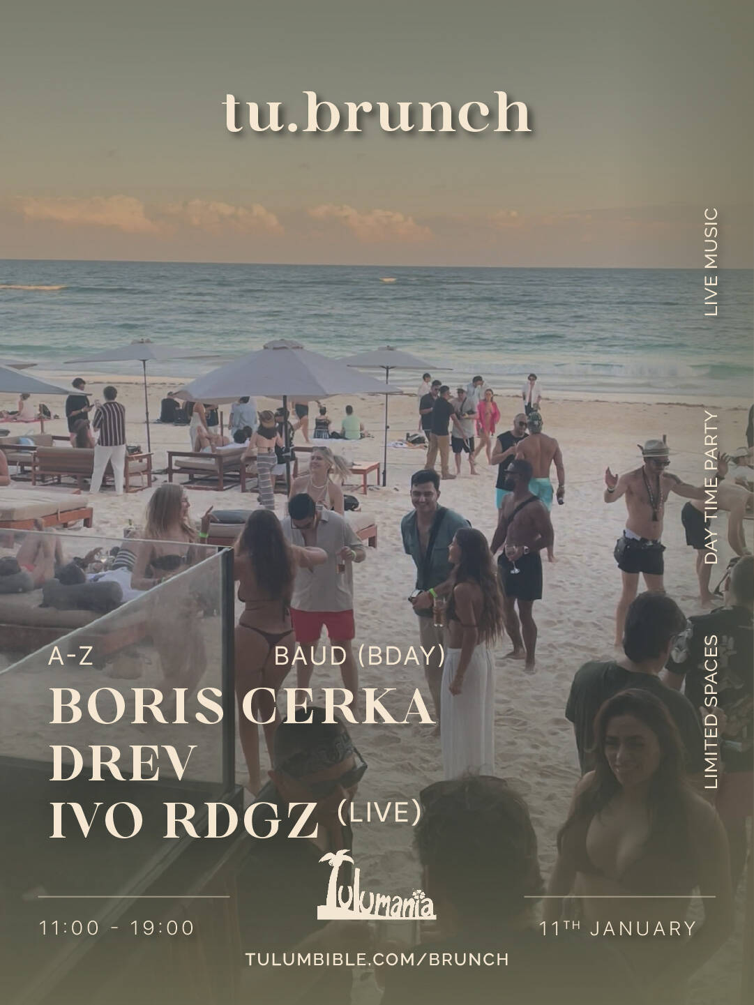 Expect a high-energy Sunday by the beach, with music playing throughout the day, space to dance, connect, and enjoy the moment, and a crowd that comes ready for good vibes. Tulumania offers great food and drinks, comfortable beachfront areas, and the perfect setting to enjoy sunshine, music, and the Tu Brunch atmosphere from day into sunset.