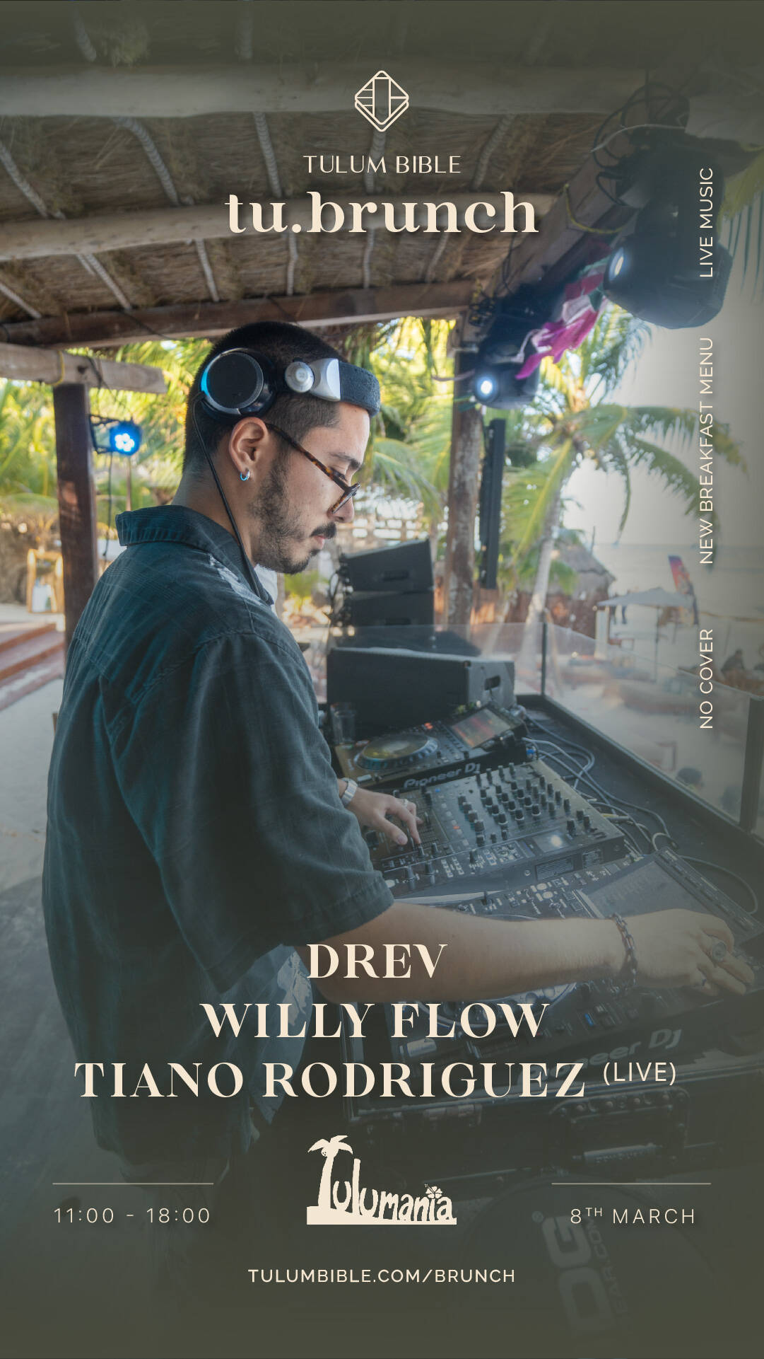 Expect a fun Sunday by the beach, with music playing throughout the day, space to dance, connect, and enjoy the moment, with the crowd that comes for good vibes. Tulumania offers great food and drinks, comfortable beachfront areas, and the perfect setting to enjoy sunshine, music, and the Tu Brunch atmosphere from day into sunset.